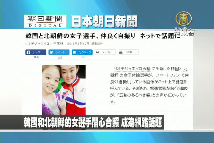 【新唐人亞太台 2016 年 08 月 11 日訊】來看到日本朝日新聞:來自韓國和北朝鮮的2名女子體操選手在奧運賽場開心合照,引起網路熱議,稱讚這才是奧運精神。
