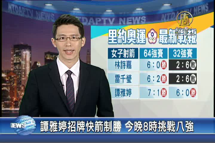 【新唐人亞太台 2016 年 08 月 11 日訊】再來關心里約奧運,中華隊的最新戰況。射箭個人對抗賽 第二輪賽事,昨天上陣打先鋒的林詩嘉首戰以 局分6:0 擊敗埃及對手晉級,可惜32強2:6不敵印度選手。而雷千瑩對決頭號種子南韓勁敵崔美善,以2比6落敗,無緣晉級16強。而譚雅婷發揮「快射」功力,連過兩關,擊敗加拿大和烏克蘭的好手,成為唯一取得16強資格的台灣選手;今晚8點,也就是現在,譚雅婷正在 力拼晉級8強,我們也一起為譚雅婷加油。
