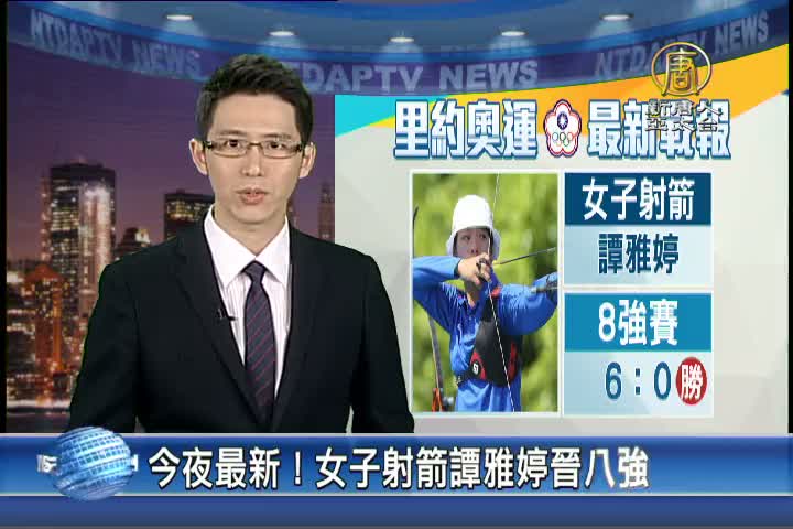 【新唐人亞太台 2016 年 08 月 11 日訊】最新消息。里約奧運女子射箭個人賽16強賽,中華隊譚雅婷再過一關,今晚在16強賽對上印度選手庫瑪莉,譚雅婷只花了3局就搞定,以6比0扳倒對手,殺進前8強,距離獎牌只剩一步之遙。