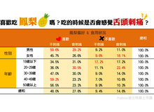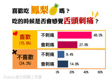 Pollster波仕特線上市調網詢問「請問你喜歡吃『鳳梨』嗎?吃的時候是否會感覺『舌頭刺痛』?」。調查結果顯示喜歡吃鳳梨的比例占全體受訪者之75.8%,其中吃了「不刺痛」與「會刺痛」之比例分別占61.1%與11.5%。而表示不喜歡的24.2%受訪者中,「不刺痛」與「會刺痛」分別占9.4%與14.8%。結果顯示喜歡吃「鳳梨」之民眾高達七成五,而無論喜歡「鳳梨」與否,吃的時候會出現「舌頭刺痛」之比例約占四成(42.6%)。