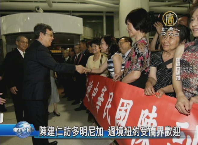 【新唐人亞太台 2016 年 08 月 14 日訊】副總統陳建仁,昨晚首次以中華民國副總統的身分,率團出訪友邦多明尼加,出席總統梅迪納的就職典禮。這次出訪來回都將過境美國紐約,今天抵達美國甘迺迪機場時,受到當地駐外官員,及超過50名僑界代表迎接。訪問團預計在8月20日凌晨,就會回到台灣。
