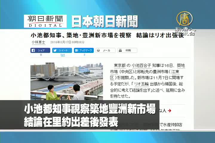 【新唐人亞太台 2016 年 08 月 17 日訊】來看到日本朝日新聞報導:日本東京都知事小池百合子,視察豐洲市場,這是築地市場拆遷後的新場地。小池表示她從里約奧運出差回來後再發表視察結論。