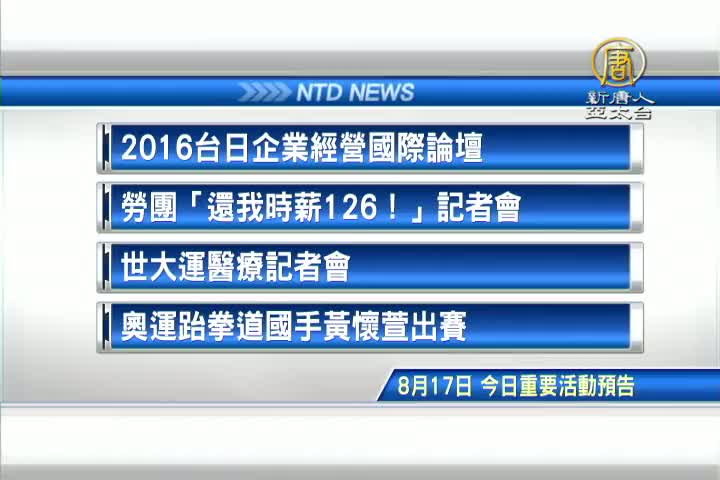 【新唐人亞太台 2016 年 08 月 17 日訊】接著看到,今天,8月17日,星期三,有哪些重要活動。首先是,2016台日企業經營國際論壇;勞團「還我時薪126!」記者會;世大運醫療記者會;以及,今晚,奧運中華代表隊,跆拳道國手黃懷萱首度出賽。
