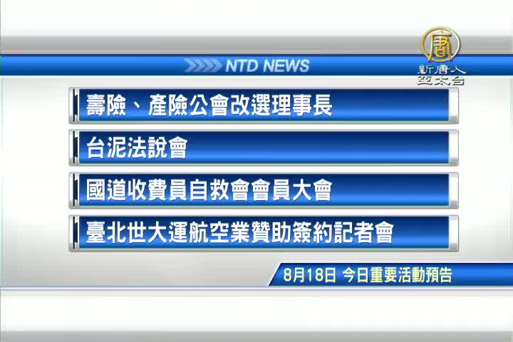 【新唐人亞太台 2016 年 08 月 18 日訊】接著看到,今天,8月18日,星期四,有哪些重要活動。首先是,壽險、產險公會上午改選理事長;再來是,台泥法說會 ;國道收費員自救會今天舉行會員大會;以及臺北世大運航空業贊助簽約記者會。