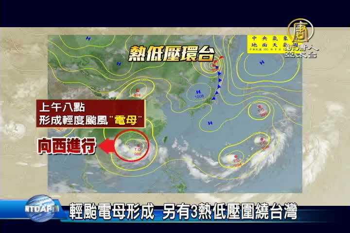 靠近中國廣東東方海面的熱帶性低氣壓,上午8點已經形成輕度颱風「電母」向西進行,另外日本東方海面上,以及關島西北西方和關島東北方,都各有熱帶性低氣壓圍繞台灣,天氣也將受到影響。