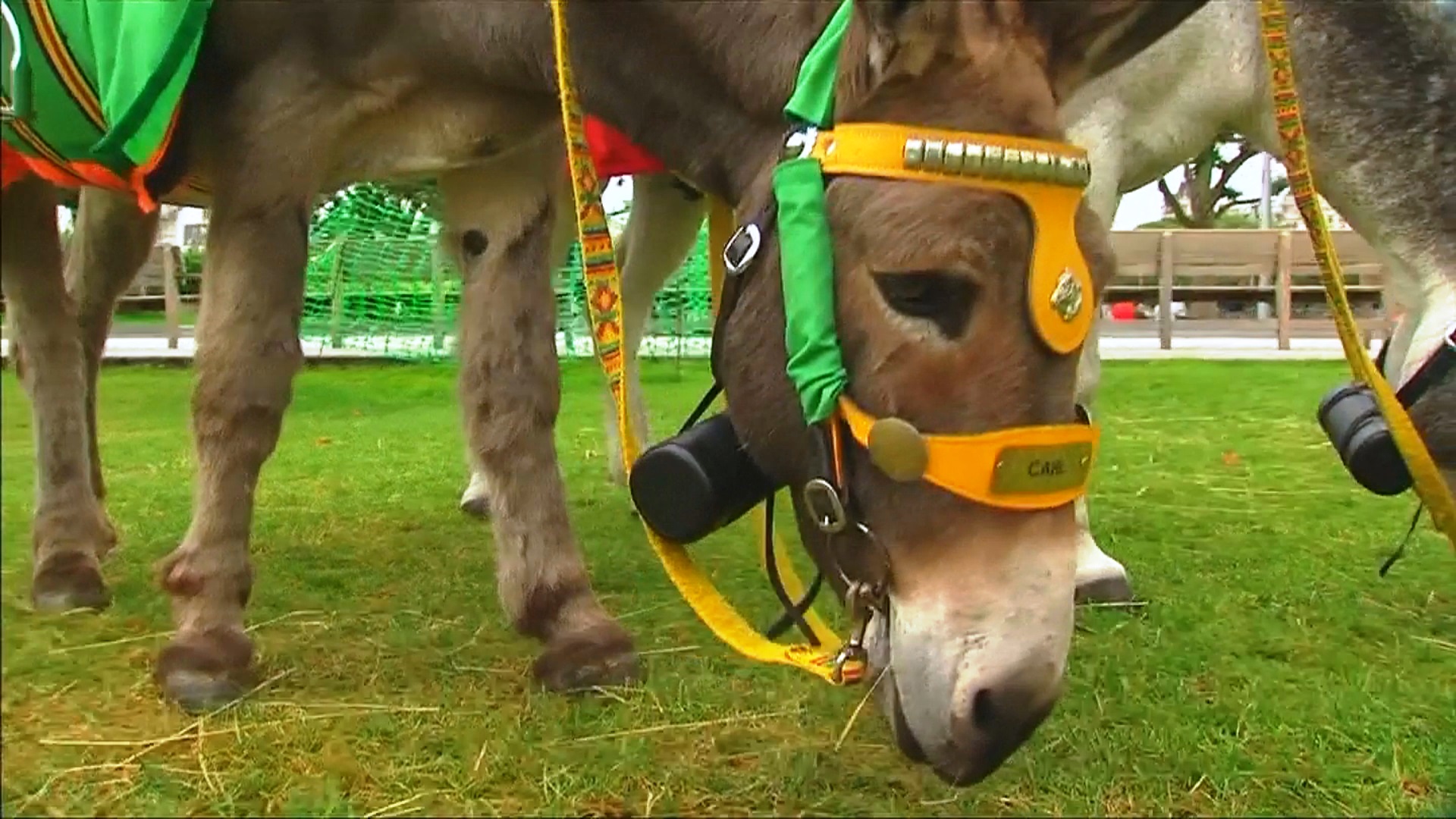 公園的草地上,幾隻可愛的驢子在吃草。一個大大的牌子上寫著「騎驢(Donkey Rides)」。除此之外,他們的脖子上戴著一個,號稱可以「翻譯牠們叫聲」的機器,讓人們可以更了解驢子的情緒與行為。