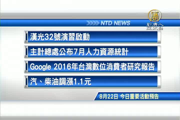 【新唐人亞太台 2016 年 08 月 22 日訊】接著看到,今天,8月22日,星期一有哪些重要活動。首先是,漢光32號演習今天啟動。財經消息,主計總處公布7月人力資源統計。再來是,Google公布2016年台灣數位消費者研究報告 。最後是民生消息,中油宣布,汽、柴油今天起調漲1.1元。
