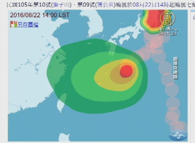 【新唐人亞太台 2016 年 08 月 22 日訊】歡迎回來。今年第9號颱風「蒲公英」,已經在今天中午左右,從日本關東千葉縣館山市登陸,而這也是近11年來,首度有颱風從關東直接登陸,強風豪雨造成關東交通大亂, JR東日本宣布停開107班特快車,羽田機場也取消將近300班日本國內線。氣象局表示,「蒲公英」對台灣沒有影響,而至於另一個輕颱「獅子山」,未來路徑有可能朝琉球方向移動,有沒有可能影響台灣,要到星期三過後,才會比較明朗。
