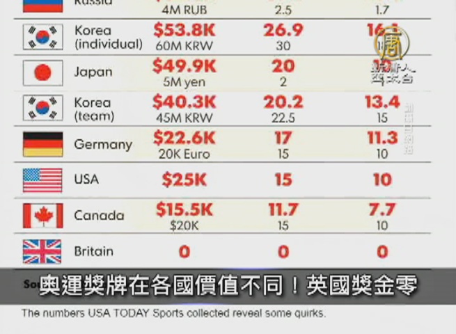 【新唐人亞太台 2016 年 08 月 23 日訊】奧運獎牌在各國價值不同!英國獎金零