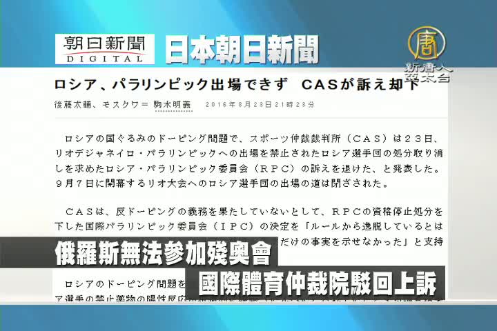 【新唐人亞太台 2016 年 08 月 24 日訊】來看到日本朝日新聞報導:因興奮劑問題遭禁賽,俄羅斯要求取消處分的上訴被國際體育仲裁院駁回,不得參加殘奧會。