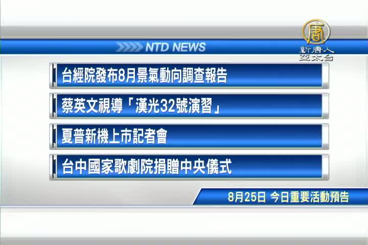 【新唐人亞太台 2016 年 08 月 25 日訊】接著看到,今天,8月25日,星期四,有哪些重要活動。首先是,台經院發布8月景氣動向調查報告,蔡英文視導「漢光32號演習」;夏普新機上市記者會;以及,台中國家歌劇院捐贈中央儀式。