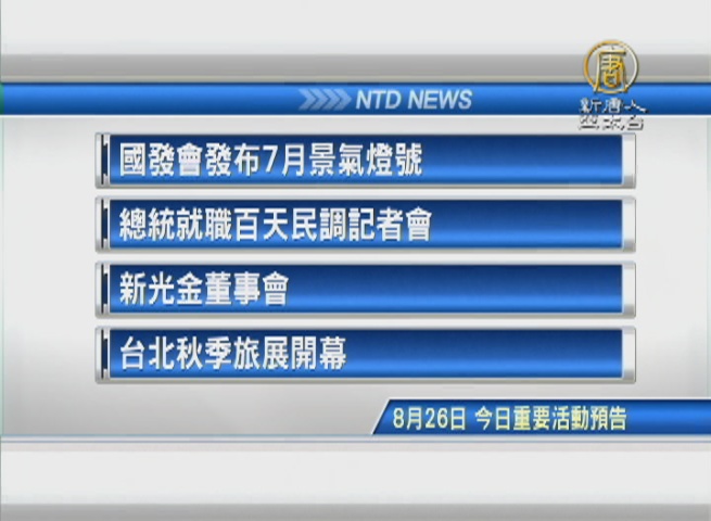 【新唐人亞太台 2016 年 08 月 26 日訊】接著看到,今天,8月26日,星期五,有哪些重要活動。首先是,國發會發布7月景氣燈號;總統就職百天民調記者會;新光金董事會;以及,台北秋季旅展開幕。