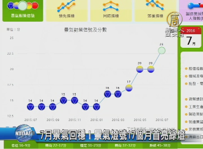 【新唐人亞太台 2016 年 08 月 26 日訊】國發委會今天公布7月景氣燈號,出現17個月以來首次的綠燈,主要是因為 機械及電機設備進口、股市和批發零售的 表現好轉,綜合判斷分數一次加3分,讓景氣燈號從代表景氣「轉向」的黃藍燈,轉為景氣「穩定」的綠燈。