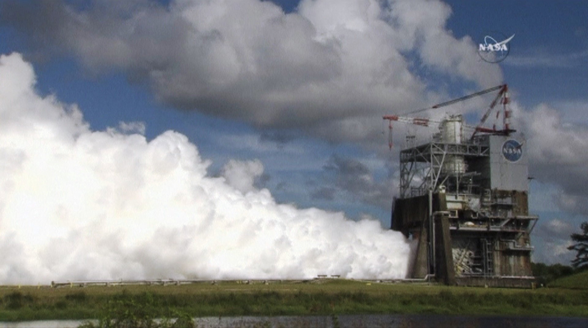 8月18日在密西西比州聖路易灣的史丹尼斯太空中心(Stennis Space Center),太空梭主引擎RS-25被固定在一座獨立的建築物內,點火後,引擎發出巨大的隆隆聲響,建築物外可以看見大量的濃煙排出,測試場外吸引了眾多前來觀看的圍觀群眾。