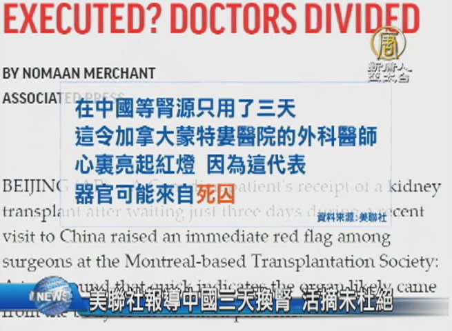 美聯社8月27日報導,一名加拿大病患自中國返回加國後,向醫生坦承,在中國短短三天就能進行換腎手術,報導表示「在中國等腎源只用了三天,這令加拿大蒙特婁醫院的外科醫師,心裏亮起紅燈,因為這代表,器官可能來自死囚」。