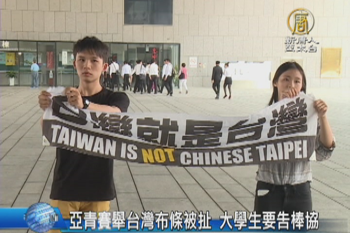 【新唐人亞太台 2016 年 09 月 01 日訊】亞洲青棒錦標賽31日晚間在台中市洲際棒球場,由台灣隊出戰日本隊,但開賽前,有一群靜宜大學的學生,自發舉起「台灣就是台灣」的白色布條,遭到工作人員制止,甚至搶下布條,被請出球場,事後才被告知屬於政治標語,引發學生不滿,決定提告。