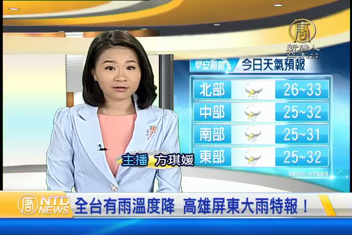 【新唐人亞太台 2016 年 09 月 02 日訊】歡迎您收看9月2日的早安新唐人,我是方琪媛。先來帶您關心今天的天氣情況。受到低壓帶影響,今天全台各地有雨。氣象局還針對高雄市、屏東縣發布大雨特報,今天高溫會比昨天降2到3度左右,西半部高溫約32、33度,東半部高溫約30、31度。另外,輕度颱風南修昨天形成,目前遠離台灣,朝日本九州前進。帶您一起來看到國際媒體重要訊息。