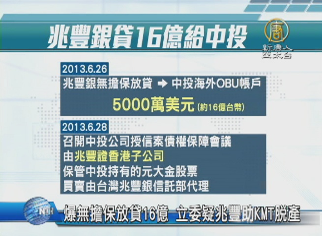 【新唐人亞太台 2016 年 09 月 02 日訊】不過,兆豐銀涉入洗錢案,延燒媒體版面半個月。媒體報導,兆豐金在 蔡友才擔任董事長任內,對國民黨黨營事業的融資金額不小,甚至超過百億元,外界也質疑,兆豐銀是否協助國民黨洗錢,今天(2日)又有立委爆料,兆豐銀一筆對中投公司16億的無擔保放款,恐怕難以追回。