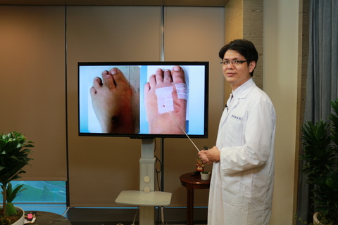 足踝科羅勝彬醫師表示,長期穿包鞋加上短趾症,容易導致拇趾外翻發生,併發拇囊炎、蹠骨轉移痛,需接受微創切骨矯正。(圖/嘉義基督教醫院提供)