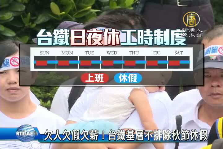 【新唐人亞太台 2016 年 09 月 06 日訊】台灣基層勞工要求休假和加薪的抗爭,近來接踵而起,台鐵員工今天下午發動歷年來首次的抗爭活動,大約400名台鐵產業工會成員,聚集在交通部外,抗議鐵路局長期忽視基層的員工,人力不足加上工作環境疏漏,導致員工長年處於勞累 得不到休息的狀態,他們希望交通部能比照勞基法,還給基層員工一個合理的休假權益。