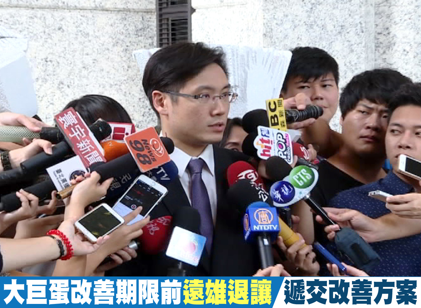 【新唐人亞太台 2016 年 09 月 07 日訊】新聞首先來看到,大巨蛋停工超過一年,台北市政府日前對遠雄下最後通牒,要求遠雄在明天9月8日前,完成建造變更,並提出完工計畫,否則就解約。繼昨天發聲明釋出善意後,遠雄下午更進一步做出退讓,表示願意依照法規標準來執行修正,並已送出改善方案。