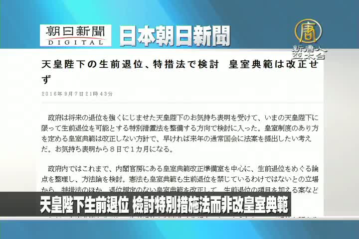 【新唐人亞太台 2016 年 09 月 08 日訊】來看到日本朝日新聞報導:政府對於天皇陛下強烈的生前退位意願,檢討實施特別措施法,但並不准備改變規定皇室制度的皇室典範。