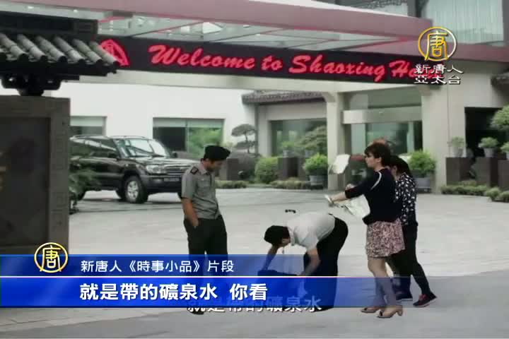 新唐人《時事小品》片段:「欸,站住!把包都打開。啊,沒有啥,就是帶的礦泉水,你看,都明天旅遊用的。礦泉水?嗯啊。給我挨個喝一遍。啊!?保安大哥,還喝啊!」