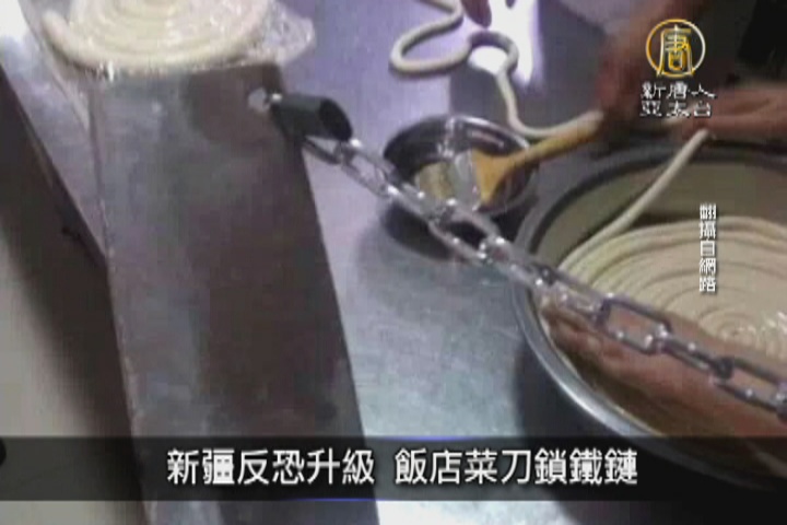 新疆省會烏魯木齊市反恐再度提升,除大型商場恢復安檢措施、設置安檢門,居民社區有武裝人員巡邏外,就連飯店的菜刀,也被鎖上鐵鏈。引發網民嘲諷。