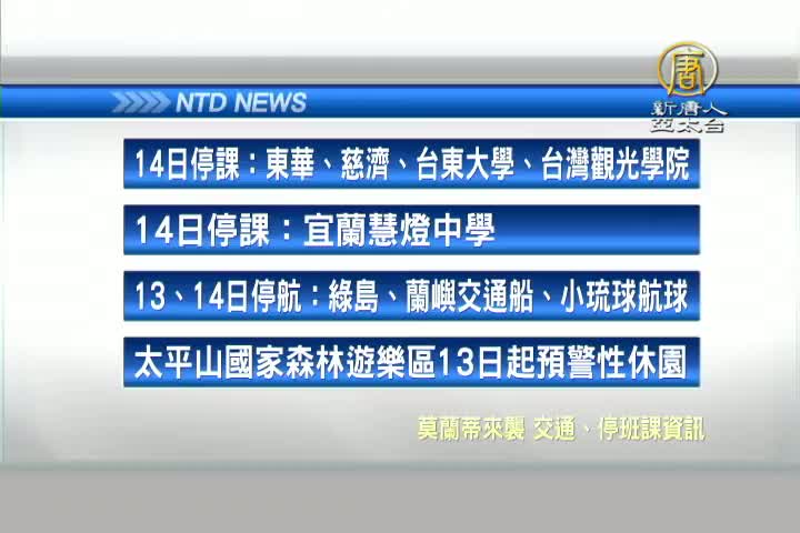 【新唐人亞太台 2016 年 09 月 13 日訊】中秋連假前夕,強颱莫蘭蒂來襲,氣象局在9個小時內,接連發布海上、陸上颱風警報,目前已經有4所大學、1間中學提前宣布14號,也就是周三停課。目前宣布14日星期三停課的學校有:東華大學、慈濟大學、台灣觀光學院、台東大學,以及宜蘭慧燈中學。而綠島、蘭嶼往返台灣的交通船,今明兩天全面停航;行駛東港小琉球航線的民船、泰富輪,也宣布週三、週四停航。此外,太平山國家森林遊樂區13日起預警性休園,遊客請勿上山。