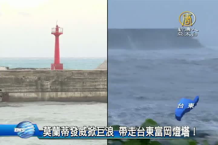 【新唐人亞太台 2016 年 09 月 14 日訊】強颱「莫蘭蒂」發威,在台東部份,富岡漁港掀起將近10公尺巨浪,越過港堤,當地提醒船隻的號誌紅燈塔,因為不堪17級風浪襲擊,被打斷吞噬。