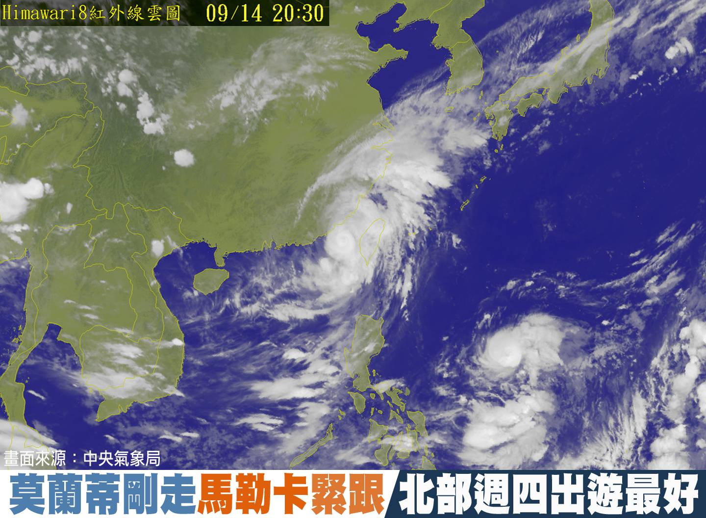 【新唐人亞太台 2016 年 09 月 14 日訊】強颱莫蘭蒂剛走中颱馬勒卡緊跟而來,雙颱幾乎是無縫接軌,讓今年的賞月指數有很大的變數,氣象達人說,東南部下雨機率還是很高,建議北部觀眾朋友,在下一個颱風來襲前,把握星期四出遊與賞月的機會。