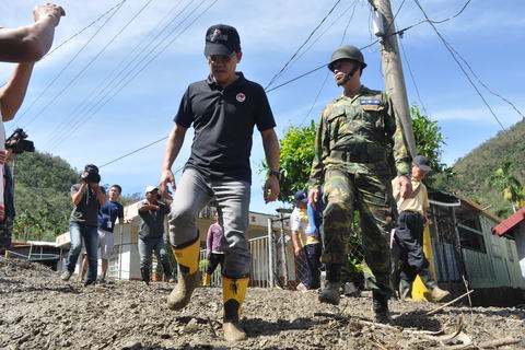 台東縣長黃健庭16日一早,勘察大武鄉愛國埔本部落土石流災情,以及了解國軍協助清理狀況。(台東縣政府提供)