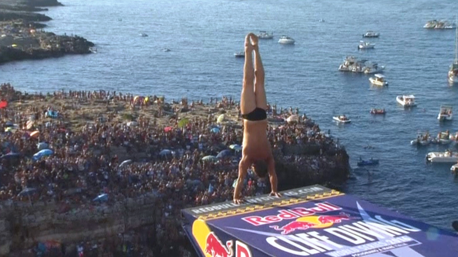 從直升機上鳥瞰著碧海藍天,海上的小船上也是擠滿了觀眾。在蔚藍的天空下,懸崖上的跳台上多位選手一同跳水,觀眾們發出歡呼聲。這是紅牛懸崖跳水競賽於8月在義大利舉行的現場。一起來看看選手的表現。