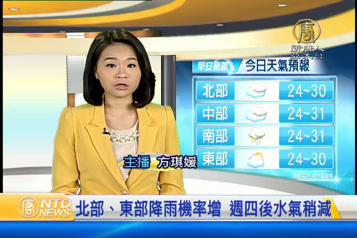 【新唐人亞太台 2016 年 09 月 20 日訊】歡迎您收看9月20日的早安新唐人,我是方琪媛。先來帶您關心今天的天氣情況。因為東北風逐漸增強,所以北部、東部地區,今天降雨機率會增加,今天早晚低溫約24到26度左右,而這股東北風將會影響台灣一個星期,星期四後水氣會漸減。所以這段期間,提醒觀眾朋友出門最好還是準備雨具。帶您一起來看到國際媒體重要訊息。