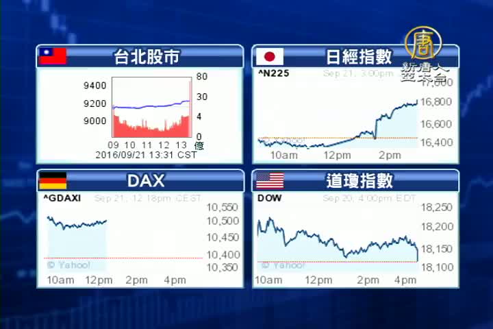【新唐人亞太台 2016 年 09 月 21 日訊】今晚,美聯儲,就要公佈議息結果,儘管升息機率不高,市場觀望氣氛濃厚,外資明顯縮手,帶您看到,今天,亞股中,率先開盤的日本,在11點過後急拉,促使台股特定買盤進場拉抬,電子、金融大型龍頭股回神,拉抬指數回復平盤之上,終場上漲66.92點,以9228.5點作收,重新站回9200點之上。不過,成交量僅709.31億元。