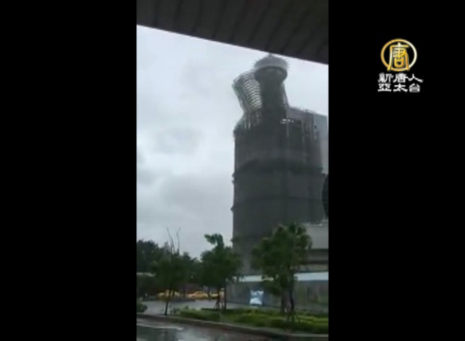【新唐人亞太台 2016 年 09 月 27 日訊】颱風梅姬來襲,全台逐漸進入暴風圈,台中市中區金沙大樓重建工程今天(27日)中午傳出鷹架倒塌意外,1輛自小客車遭倒塌的鷹架砸中。驚險過程都被網友直擊拍下。