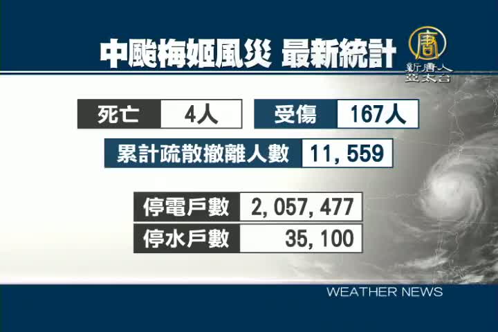 【新唐人亞太台 2016 年 09 月 27 日訊】統計目前梅姬颱風的最新災況,目前為止,共造成4人死亡,167人受傷,總共有1萬1千多人被撤離家園,另外,有兩百多萬戶人家停電。 台水公司表示,目前全台有3.5萬戶停水。