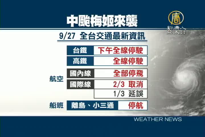 【新唐人亞太台 2016 年 09 月 27 日訊】接著帶您關心,梅姬颱風的最新交通異動情況,目前,台鐵、高鐵已經全面停駛,高鐵明天下午兩點將恢復營運。在航空運輸部分,國內線航班全部停飛,國際線有三分之二航班取消。另外,北捷除了文湖線和高架路段停駛之外,北捷與高捷都正常營運。 在公車部分,台北、高雄、台中公車,從今天下午開始,全面停駛。 國道客運也全面停開,另外,YouBike也停止營運。