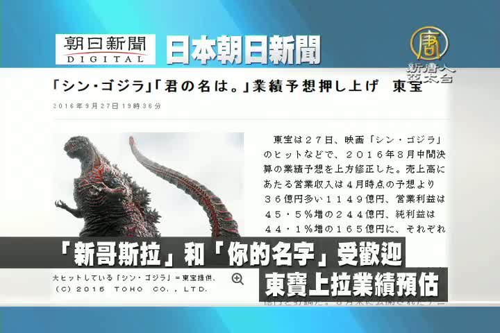 【新唐人亞太台 2016 年 09 月 28 日訊】來看到日本朝日新聞報導:《正宗哥斯拉》和《你的名字》受歡迎,日本五大電影公司之一的東寶,上拉業績預估。