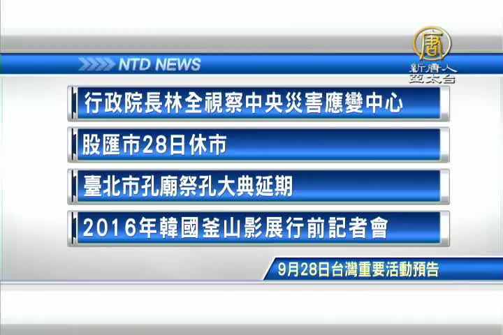【新唐人亞太台 2016 年 09 月 28 日訊】接著看到,今天,9月28日,星期三,有哪些重要活動。首先是,早上9點,行政院長林全再次前往中央災害應變中心視察;受梅姬颱風影響,28號股匯市繼續休市一天。另外,今天是 928教師節,原訂今天舉行的臺北市孔廟祭孔大典,將延期舉行,舉辦日期會另行公告。最後是,2016年韓國釜山影展的行前記者會。