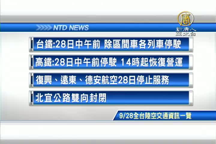 【新唐人亞太台 2016 年 09 月 28 日訊】接下來,為您整理今天9月28號的全台交通資訊。台鐵,今天中午前,除區間車以外,各次列車停駛。高鐵,今天中午前停駛,下午2點起恢復營運。航空交通部分,復興、遠東、德安航空28號全天停止服務,搭乘其他航空公司的旅客,建議出發前先確認航班資訊。北宜公路31.6公里處昨天發生土石崩落,目前暫時是雙向封閉。