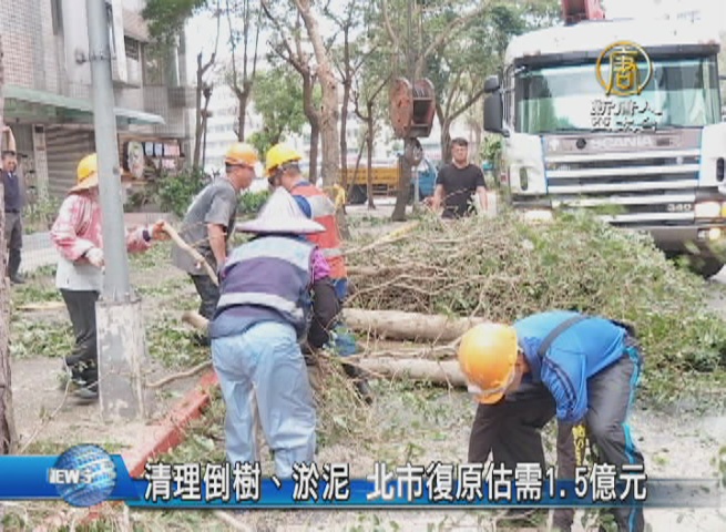 【新唐人亞太台 2016 年 09 月 28 日訊】梅姬颱風肆虐全台,台北市的市容 也滿目瘡痍,今天一早,清潔隊員就開始清理路樹和殘枝,而河濱公園也有淤泥,必須立即清理,北市工務局表示,復原經費,初步估算需要約1.5億元。