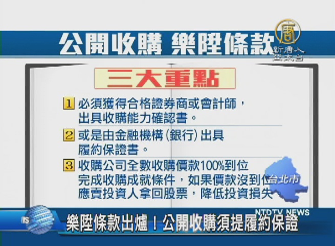 【新唐人亞太台 2016 年 09 月 28 日訊】為了避免樂陞案再度發生,金管會今天預告,修正公開收購管理辦法草案。規定公開收購公司,未來必須要出具支付能力確認書,或由金融機構,提出履約保證,才能進行公開收購。