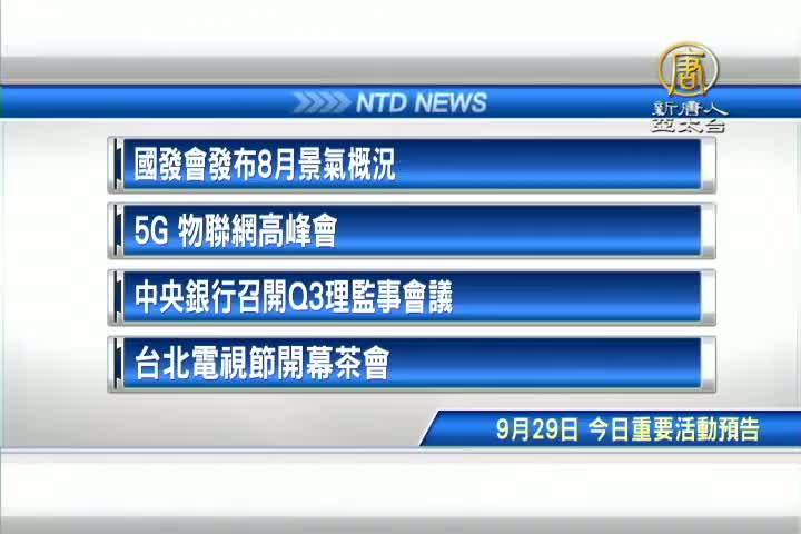 【新唐人亞太台 2016 年 09 月 29 日訊】接著看到,今天,9月29日,星期四,有哪些重要活動,首先是,國發會發布8月景氣概況;5G 物聯網高峰會;中央銀行召開Q3理監事會議,是否連續第 5 度降息受到市場關注;以及,台北電視節開幕茶會。