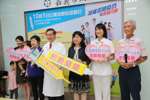 【新唐人亞太台 2016 年 09 月 29 日訊】秋冬交替季節,不但開始進入流感高峰期,甚至連輪狀病毒、諾羅病毒等,也蠢蠢欲動。嘉義市衛生局今天(29日)舉辦流感疫苗及肺炎鏈球菌疫苗10月1日開始接種宣導記者會,呼籲民眾主動接種疫苗,以保護自己的健康,也可使社區中流感發生的機率降低。