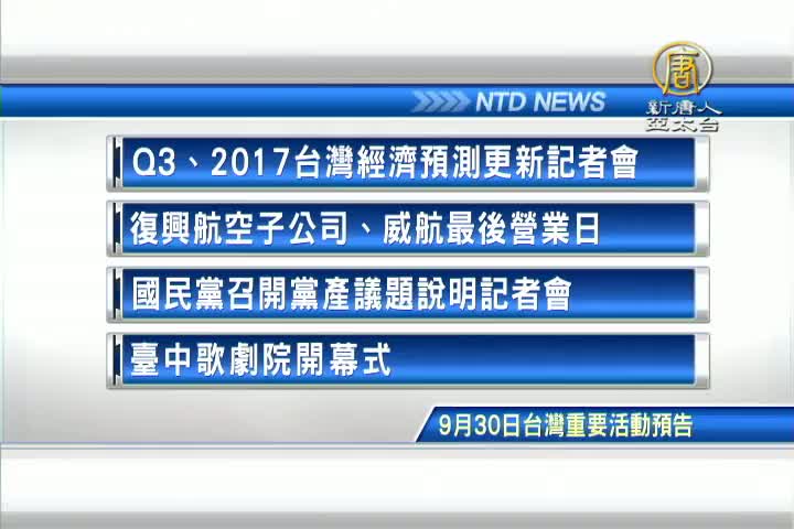 【新唐人亞太台 2016 年 09 月 30 日訊】接著看到,今天,9月30日,星期五,有哪些重要活動,首先是,元大寶華經濟研究院發布2016第3季、及2017年台灣經濟預測更新記者會;今天是復興航空子公司、廉價航空 威航的 最後營業日;再來是,國民黨下午要召開黨產議題說明記者會 以及,臺中歌劇院開幕式。