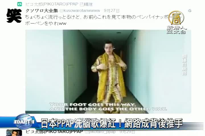 【新唐人亞太台 2016 年 10 月 02 日訊】日本最近出現一首網路爆紅歌曲PPAP,將3個英文單字PEN、APPLE、PINEAPPLE,編成一首朗朗上口的歌曲,搭配逗趣的舞蹈,掀起熱潮,不少人探討洗腦歌爆紅原因,YouTube趨勢分析經理艾羅卡認為,網路,是背後的重要推手。