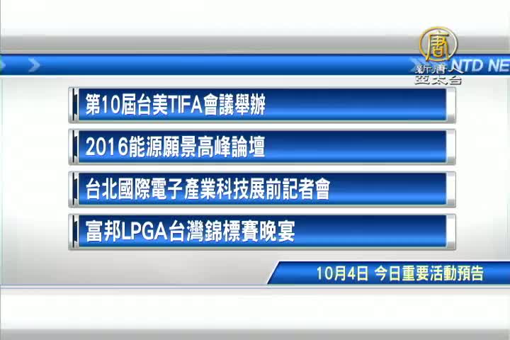 【新唐人亞太台 2016 年 10 月 04 日訊】接著看到,今天,10月4日,星期二,有哪些重要活動,首先是,第10屆台美TIFA會議在華府舉辦。再來是,2016能源願景高峰論壇,今天在台北舉辦,多位地方首長將出席。以及,台北國際電子產業科技展,今天舉辦展前記者會。最後是,體壇消息,富邦LPGA台灣錦標賽,今天為多國球員舉辦歡迎晚宴。
