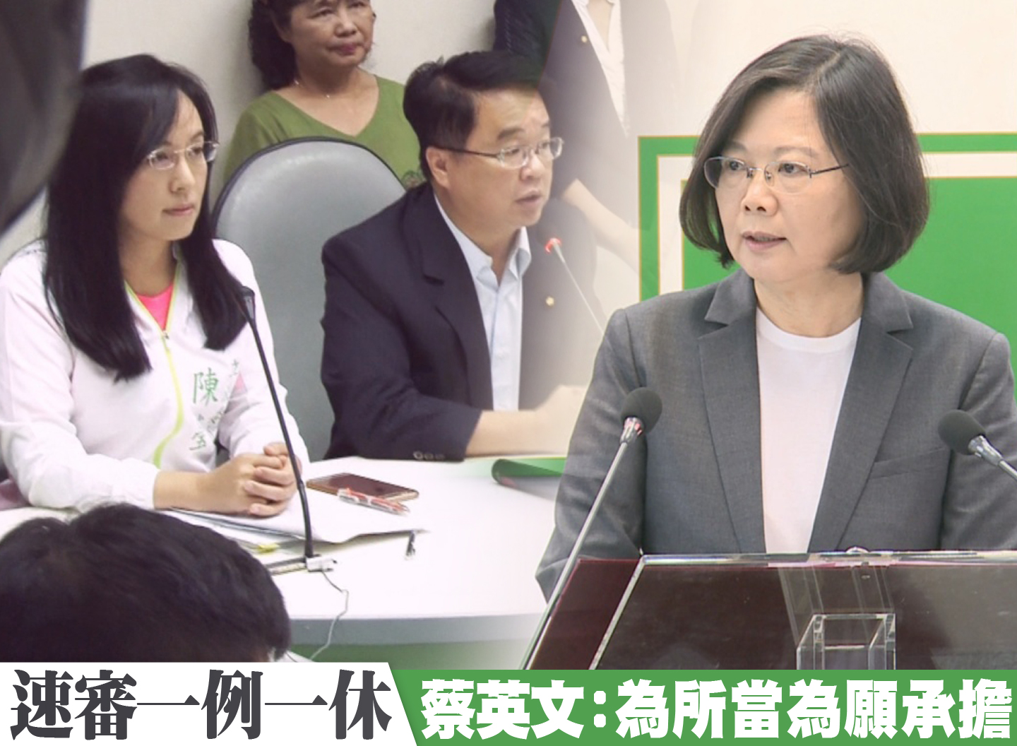 【新唐人亞太台 2016 年 10 月 05 日訊】立法院一例一休火速初審,因為總統蔡英文,周一才領著府院黨高層開決策會議,裁示年底前要完成周休二日配套修法,而今天(5日)上午立法院才剛剛初審完,下午總統蔡英文就親上火線,承擔修法壓力。