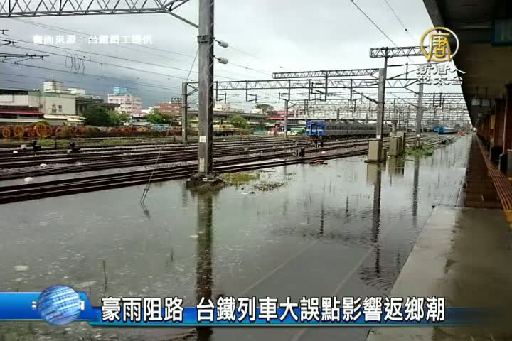 【新唐人亞太台 2016 年 10 月 07 日訊】歡迎回來。受到豪大雨影響,返鄉輸運也收到波及,尤其台鐵頻傳災情,台東鹿野 至 山里間,一度因路樹壓到電車線交通中斷2小時,花蓮火車站淹水,宛如水都威尼斯,旅客一度還要涉水搭車。台鐵統計,受豪雨影響,截至下午4點前已經20輛車次延誤,近兩千名旅客受到影響。西部幹線在下午4點多的時候,斗六開往潮州的區間車在行駛到嘉義、南靖之間時,撞到行人,經停車處理後,在傍晚5點多放行,總計影響7個列次、2,500多位旅客。